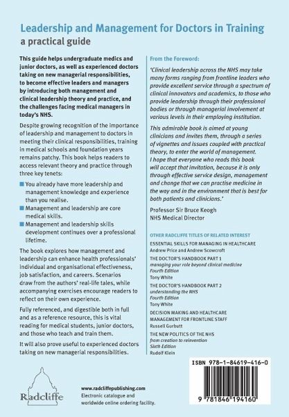 This guide helps undergraduate medics and junior doctors, as well as experienced doctors taking on new managerial responsibilities, to become effective leaders and managers by introducing both management and clinical leadership theory and practice, and the challenges facing medical managers in today's NHS. Despite growing recognition of the importance of leadership and management to doctors in meeting their clinical responsibilities, training in medical schools and foundation years remains patchy. This book helps readers to access relevant theory and practice through three key tenets: *