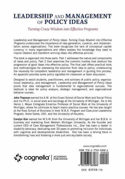 Leadership and Management of Policy Ideas: Turning Crazy Wisdom into Effective Programs underscores the importance of idea generation, curation, and implementation across organizations. The book recognizes the lack of conceptual capital currency in many organizations and offers readers the knowledge they need to inspire ideation and transform winning ideas into effective policies. The book is organized into three parts. Part 1 addresses the nature and components of ideas and policy. Part 2 then examines the common hurdles that obstruct the progression of good ideas into effective policy. The final part offers practical tools and methodologies for overseeing the evolution from idea to policy, underscoring the necessity for competent leadership and management in guiding this process. An appendix provides some policy vignettes for classroom or team discussion. Designed to assist students, practitioners, and scholars of public policy, organizational leadership, and management, Leadership and Management of Policy Ideas posits that idea management is fundamental to organizational success. The textbook is ideal for policy analysis, strategic management, and organizational behavior courses.
