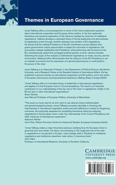 In this 2006 book, Jonas Tallberg offers a novel perspective on some of the most fundamental questions about international cooperation and European Union politics. Offering the first systematic theoretical and empirical exploration of the influence wielded by chairmen of multilateral negotiations, Tallberg develops a rationalist theory of formal leadership and demonstrates its explanatory power through carefully selected case studies of EU negotiations. He shows that the rotating Presidency of the EU constitutes a power platform that grants governments unique opportunities to shape the outcomes of negotiations. His provocative analysis establishes that Presidencies, while performing vital functions for the EU, simultaneously exploit their privileged political position to favour national interests. Extending the scope of the analysis to international negotiations on trade, security and the environment, Tallberg further demonstrates that the influence of the EU Presidency is not an isolated occurrence but the expression of a general phenomenon in world politics - the power of the chair.