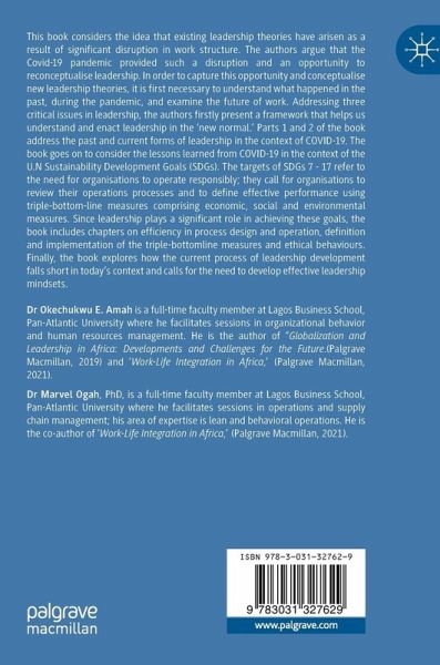 Addressing three critical issues in leadership, the authors firstly present a framework that helps us understand and enact leadership in the 'new normal.' Parts 1 and 2 of the book address the past and current forms of leadership in the context of COVID-19. The book goes on to consider the lessons learned from COVID-19 in the context of the U.N Sustainability Development Goals (SDGs). The targets of SDGs 7 - 17 refer to the need for organisations to operate responsibly; they call for organisations to review their operations processes and to define effective performance using triple-bottom-line measures comprising economic, social and environmental measures. Since leadership plays a significant role in achieving these goals, the book includes chapters on efficiency in process design and operation, definition and implementation of the triple-bottom-line measures and ethical behaviours. Finally, the book explores how the current process of leadership development falls short in today's context and calls for the need to develop effective leadership mindsets