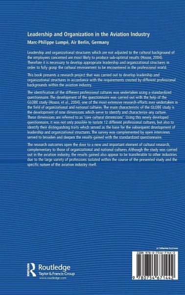 Leadership and organisational structures which are not adjusted to the cultural background of the employees concerned are most likely to produce sub-optimal results (House, 2004). Therefore it is necessary to develop appropriate leadership and organisational structures in order to fully grasp the cultural environment to be encountered in the professional world. This book presents a research project that was carried out to develop leadership and organisational structures in accordance with the requirements created by different professional backgrounds within the aviation industry. The identification of the different professional cultures was undertaken using a standardised questionnaire. The development of the questionnaire was carried out with the help of the GLOBE study (House, et al., 2004), one of the most extensive research efforts ever undertaken in the field of organisational and national cultures. The main characteristic of the GLOBE study is the development of nine dimensions which serve to identify and characterise any culture. These dimensions are referred to as 'core cultural dimensions'. Using this newly developed questionnaire, it was not only possible to isolate 12 different professional cultures, but also to identify their distinguishing traits which served as the base for the subsequent development of leadership and organisational structures. The survey was complemented by open interviews served to broaden and deepen the results gained with the standardised questionnaire. The research outcomes open the door to a new and important element of cultural research, complementary to those of organisational and national cultures. Although the study was carried out in the aviation industry, the results gained also appear to be transferable to other industries due to the large variety of professions isolated within the course of the presented study and the specific nature of the aviation industry itself.