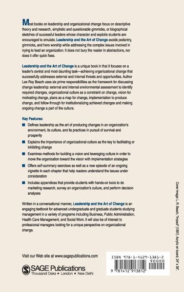 Leadership and the Art of Change is a unique book in that it focuses on a leader's central and most daunting taskachieving organizational change that successfully addresses external and internal threats and opportunities. Author Lee R. Beach uses six prime responsibilities as the framework for discussing change leadership: external and internal environmental assessment to identify required changes, organizational culture as a constraint on change, vision for motivating change; plans as a map for change, implementation to produce change, and follow-through for institutionalizing achieved changes and making ongoing change a part of the culture.