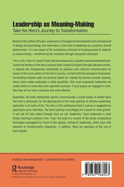 Based on the author's 30 years experience of management development and a background in design and psychology, this book takes a fresh look at leadership as a systemic shared phenomenon. It is one aspect of the evolutionary principle of bringing people to maturity as human beings - transforming the immature through purposeful adventure. This is not a "how-to" book of tools and techniques but is a guide to personal development. It plots the territory of the hero's journey (after Joseph Campbell) through unknown worlds. It explains the metaphorical relationship to personal and collective transformation by means of the cyclic pattern of the hero's journey, overlaid with the enneagram framework.Succeeding chapters spell out practical details for making the journey towards maturity, which alone makes leadership a viable possibility. Only such purposeful leadership will enable others to make their own equivalent journeys. If such people are engaged in work, then they will be more conscious and more effective.Essentially, the book is intentionally quickly communicates a broad sweep of related ideas that form a philosophy for the development of the inner qualities of effective leadership, applicable in all walks of life.The story of the archetypical hero's journey is suggested as applying to every individual. The hero's journey is an allegory for a quest for inner growth. It can rub off onto others through what we call "leadership". Such leadership is what brings meaning to people's lives.Thus this book is a counter to the empty manipulative techniques propagated by much of the popular writing on leadership, which pays little attention to transformative interaction.There are exercises at the end of each chapter and additional material is available to readers via the internet.