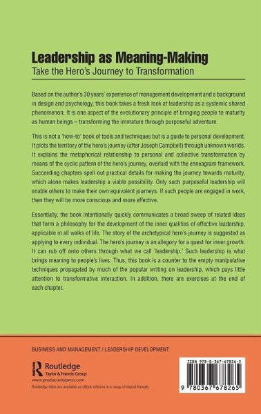Based on the author's 30 years experience of management development and a background in design and psychology, this book takes a fresh look at leadership as a systemic shared phenomenon. It is one aspect of the evolutionary principle of bringing people to maturity as human beings - transforming the immature through purposeful adventure. This is not a "how-to" book of tools and techniques but is a guide to personal development. It plots the territory of the hero's journey (after Joseph Campbell) through unknown worlds. It explains the metaphorical relationship to personal and collective transformation by means of the cyclic pattern of the hero's journey, overlaid with the enneagram framework. Succeeding chapters spell out practical details for making the journey towards maturity, which alone makes leadership a viable possibility. Only such purposeful leadership will enable others to make their own equivalent journeys. If such people are engaged in work, then they will be more conscious and more effective. Essentially, the book is intentionally quickly communicates a broad sweep of related ideas that form a philosophy for the development of the inner qualities of effective leadership, applicable in all walks of life. The story of the archetypical hero's journey is suggested as applying to every individual. The hero's journey is an allegory for a quest for inner growth. It can rub off onto others through what we call "leadership". Such leadership is what brings meaning to people's lives. Thus this book is a counter to the empty manipulative techniques propagated by much of the popular writing on leadership, which pays little attention to transformative interaction. There are exercises at the end of each chapter and additional material is available to readers via the internet.