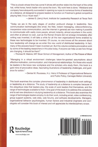 Preface. Foreword. Part 1. New Challenges for Leading at a Distance. S. Weisband Research Challenges for Studying Leadership at Distance. T. Bikson G.F. Treverton J. Moini G. Lindstrom Leadership in International Organizations: 21st Century Challenges. Part 2. Field Studies of Leadership in Distributed Work Settings. J. Cummings Leading Groups From a Distance: How to Mitigate Consequences of Geographic Dispersion. E. Bradner G. Mark Designing a Tail of Two Cities: Leaders' Perspectives on Collocated and Distance Collaboration. Y. Xiao F.J. Seagull C.F. Mackenzie K. Klein J. Ziegert Adaptation of Team Communication Patterns: Exploring the Effects of Leadership at a Distance Task Urgency and Shared Team Experience. Part 3. Experiments in Remote Leadership. S. Kahai B. Avolio Effects of Leadership Style and Anonymity on the Discussion of an Ethical Issue in an Electronic Meeting System Context. P. Balthazard D. Waldman L. Atwater The Mediating Effects of Leadership and Interaction Style in Face-to-Face and Virtual Teams. G. Stasser M. Augustinova Social Engineering in Distributed Decision Making Teams: Some Implications for Leadership at a Distance. Part 4. Leading Large-Scale Distributed Collaborations. B. Butler L. Sproull S. Kiesler R. Kraut Community Effort in Online Communities: Who Does the Work and Why? J. Birnholtz T. Finholt Cultural Challenges to Leadership in Cyberinfrastructure Development. C. Scaffidi B. Myers M. Shaw Trial by Water: Creating Hurricane Katrina "Person Locator" Web Sites. C. Torrey M. Burke M. Lee A. Dey S. Fussell S. Kiesler Approaches to Authority in Online Disaster Relief Communities After Hurricane Katrina. Part 5. Conclusion and Future Directions. S. Weisband Lessons About Leadership at a Distance and Future Research Directions.