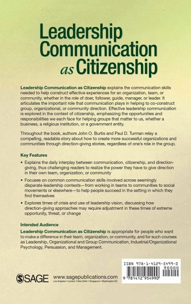 Leadership Communication as Citizenship explains the communication skills you need to help construct effective experiences for an organization, team, or community, whether in the role of doer, follower, guide, manager, or leader. It articulates the important role that communication plays in helping to co-construct group, organizational, or community direction. Effective leadership communication is explored in the context of citizenship, emphasizing the opportunities and responsibilities we each face for helping groups that matter to us, whether a business, a religious institution, or a government entity. Throughout the book, authors John O. Burtis and Paul D. Turman relay a compelling, readable story about how to create more successful organizations and communities through direction-giving stories, regardless of one's role in the group. Key FeaturesExplains the daily interplay between communication, citizenship, and direction-giving, thus challenging readers to realize the power they have to give direction in their own team, organization, or community Focuses on common communication skills involved across seemingly disparate leadership contexts-from working in teams to communities to social movements or elsewhere-to help people succeed in the setting in which they find themselves Explores times of crisis and use of leadership vision, discussing how direction-giving approaches may require adjustment in these times of extreme opportunity, threat, or change. Intended Audience: Leadership Communication as Citizenship is appropriate for anyone who wants to make a difference in their team, organization, or community, and for such courses as Leadership, Organizational and Group Communication, Industrial/ Organizational Psychology, Persuasion, and Management.