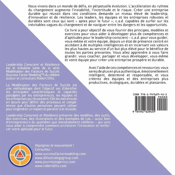 Nous vivons dans un monde de défis, en pérpetuelle évolution. L'accéleration du rythme du changement augmente l'instabilité, l'incertitude et le risque. Créer une entreprise durable qui réussit dans ces conditions demande un niveau élevé de leadership, d'innovation et de résilience. Les leaders, les équipes et les entreprises robustes et durables sont ceux qui sont aptes pour le futur , c.a.d. capables de surfer sur les inévitables vagues du changement et de naviguer entre les dangers et les opportunités. Ce livre a pour objectif de vous fournir des principes, modèles et exercices pour vous aider à développer plus de compétences et d'aptitudes pour le leadership conscient - c.a.d. pour vous guider, vous-même et votre équipe, depuis un état de présence centré en accédant à de multiples intelligences et en incarnant vos valeurs les plus hautes au service d'un but plus élévé pour le bénéfice de toutes les parties prenantes. Vous allez apprendre à vous faire grandir, vous coacher, partager et vous développer, vous-même et votre équipe pour créer une entreprise prospère et durable. Avec l'aide de ces compétences et ressources vous serez de plus en plus authentique, émotionellement intelligent, determiné et responsable, et vous créerez des équipes et des entreprises plus productives, écologiques, durables et plaisantes. Leadership Conscient et Résilience est le troisième tome de la série Modélisation des Facteurs de Succès (Success Factor ModelingTM) du célèbre auteur et consultant Robert Dilts. La Modélisation des Facteurs de Succès est une méthodologie dont l'objectif est d'identifier les principales caractéristiques et capacités partagées par les entrepreneurs, les équipes et les entreprises qui réussissent. Elle les met ensuite en ¿uvre pour définir des processus et compétences que d'autres personnes peuvent utiliser pour engendrer un impact et parvenir à la réussite. Leadership Conscient et Résilience présente des modèles, des outils, des exercices, des illustrations et des exemples de cas - aussi bien d'entrepreneurs du quotidien que mondialement célèbres - qui vont vous aider à comprendre comment orchestrer l'innovation et renforcer votre aptitude pour le futur.