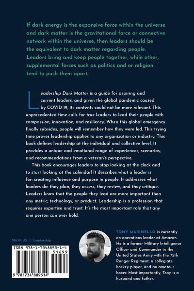 Leadership Dark Matter is a guide for aspiring and current leaders, and given the global pandemic caused by COVID-19, its contents could not be more relevant. This unprecedented time calls for true leaders to lead their people with compassion, innovation, and resiliency. When this global emergency finally subsides, people will remember how they were led. This trying time proves leadership applies to any organization or industry. This book defines leadership at the individual and collective level. It provides a unique and emotional range of experiences, scenarios, and recommendations from a veteran's perspective. This book encourages leaders to stop looking at the clock and to start looking at the calendar! It describes what a leader is for: creating influence and purpose in people. It addresses what leaders do: they plan, they assess, they review, and they critique. Leaders know that the people they lead are more important then any metric, technology, or product. Leadership is a profession that requires expertise and trust. It's the most important role that any one person can ever hold.