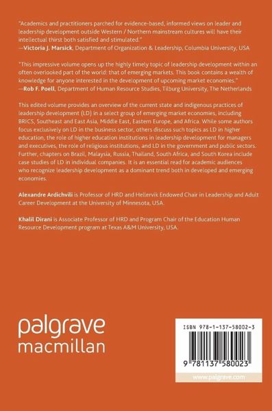1. Introduction: Leadership Development in Emerging Markets.- 2. Gerdau's Men of Steel: A Unique Case of Leadership Development in Brazil.- 3. Leadership Development in the Russian Federation.- 4. Leadership Development Models and Practices in India: Review of Literature.- 5. Leadership and Leadership Development in China.- 6. Leadership Development in South Africa.- 7. Developing Leadership Capacity in Indonesian Higher Education.- 8. Organizational Leadership Development in Malaysia: Current Practices, Challenges and Future Potentials.- 9. Leadership Development in Thailand.- 10. Leadership Development in Vietnam.- 11. Effective Leadership and Leadership Development in South Korea: Lessons Learned from Two Large Conglomerates.- 12. Leadership Development in Ghana: A New Look at an Old Concept.- 13. Leadership Development for Frontier Societies: Reflections from Kenya.- 14. Leadership in Saudi Arabia: A MultifacetedPhenomenon.- 15. Exploring Leadership Development in Turkey: Implications for Technology and Innovation.- 16. Leadership Development in the Polish Economy during the Transformation Process: Selected Issues.- 17. The shadows of the past and the hopes of the future: A road towards a comprehensive leadership development in Hungary.