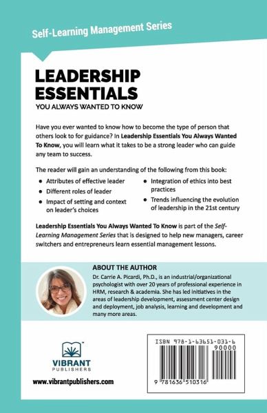 A Practical Guide to Leadership Traits, Power, Ethics, and Leading High-Performance Teams Leadership Essentials You Always Wanted to Know covers the following concepts:Attributes of an effective leader Different roles of a leader Impact of setting and context on a leader's choices Integration of ethics into best practices Trends influencing the evolution of leadership in the 21st century Learn what it takes to be a strong leader who can guide any team to success! Have you ever wanted to know how to become the type of person that others look to for guidance? In Leadership Essentials You Always Wanted to Know, you will learn what it takes to be a strong leader who can guide any team to success. Driven by the latest research on leadership, this straight-forward guide breaks down not only the traits of highly effective leaders, but also how to use those traits in a variety of situations. You do not need to be in a leadership position to benefit from the lessons detailed in this book. Aside from defining the concepts of leadership and motivation, the book explores the best practices of effective leadership and the core competencies of influential leaders. It also offers insight into real-world challenges that have been faced--and overcome--by thriving organizations. With chapter summaries, quizzes, and online resources to reinforce concepts, Leadership Essentials You Always Wanted to Know is a power-packed resource that will guide you towards becoming a better leader. About the Series The Self-Learning Management Series is designed to help students, new managers, career switchers and entrepreneurs learn essential management lessons. This series is designed to address every aspect of business from HR to Finance to Marketing to Operations, across any and every industry. Each book includes basic fundamentals, important concepts, standard and well-known principles, and practical ways of application of the subject matter. The distinctiveness of the series lies in that all the relevant information is bundled in a compact form that is very easy to interpret.