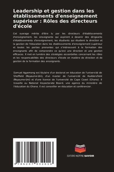 Cet ouvrage mérite d'être lu par les directeurs d'établissements d'enseignement, les enseignants qui aspirent à devenir des dirigeants d'établissements d'enseignement, les étudiants qui étudient la direction et la gestion de l'éducation dans les établissements d'enseignement supérieur et toutes les parties prenantes qui s'intéressent à la formation des enseignants afin de comprendre ce qu'est une direction et une gestion efficaces. Il met en lumière des stratégies essentielles concernant les rôles et les responsabilités des directeurs d'école en matière de direction et de gestion de la formation des enseignants.
