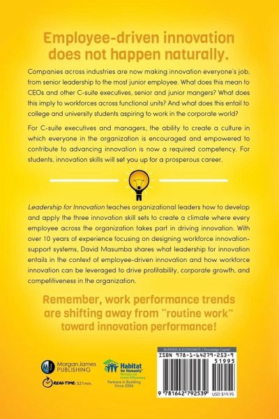 Leadership for Innovation takes a look at organizations' desire to make innovation every employee's responsibility and teaches organizational leaders to create an innovative climate. Studies have revealed that although organizations desire to make innovation every employee`s responsibility, the major challenge is how to create a climate where every employee across functional units is involved in advancing innovation. Employee-driven innovation does not happen naturally, or by relaying on traditional management tools and approaches. Organizational leaders must possess the necessary innovation skills to develop and implement crosscutting innovation-support systems and practices. With over 10 years of experience focusing on designing workforce innovation-support systems, David Masumba shares strategies and policies that help companies create a climate of innovation. Leadership for Innovation offers tools that organizational leaders across industries, individuals aspiring to assume leadership roles, and undergraduate and graduate students can apply to develop essential innovation skill sets and bring themselves or their company to a whole new level.