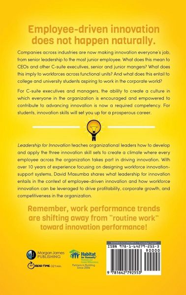 Leadership for Innovation takes a look at organizations¿ desire to make innovation every employee¿s responsibility and teaches organizational leaders to create an innovative climate. Studies have revealed that although organizations desire to make innovation every employee`s responsibility, the major challenge is how to create a climate where every employee across functional units is involved in advancing innovation. Employee-driven innovation does not happen naturally, or by relaying on traditional management tools and approaches. Organizational leaders must possess the necessary innovation skills to develop and implement crosscutting innovation-support systems and practices. With over 10 years of experience focusing on designing workforce innovation-support systems, David Masumba shares strategies and policies that help companies create a climate of innovation. Leadership for Innovation offers tools that organizational leaders across industries, individuals aspiring to assume leadership roles, and undergraduate and graduate students can apply to develop essential innovation skill sets and bring themselves or their company to a whole new level.