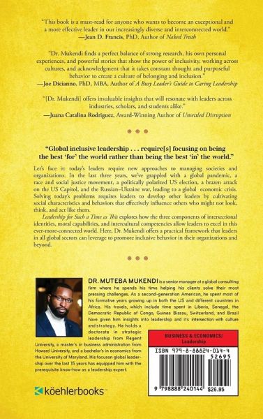 "Global inclusive leadership . . . require[s] focusing on being the best 'for' the world rather than being the best 'in' the world." Let's face it: today's leaders require new approaches to managing societies and organizations. In the last three years, we've grappled with a global pandemic, a race and social justice movement, a politically polarized US election, a brazen attack on the US Capitol, and the Russian-Ukraine war, leading to a global economic crisis. Solving today's problems requires leaders to develop other leaders by cultivating social characteristics and behaviors that effectively influence others who might not look, think, and act like them.Leadership for Such a Time as This explores how the three components of intersectional identities, moral capabilities, and intercultural competencies allow leaders to excel in this ever-more-connected world. Here, Dr. Mukendi offers a practical framework that leaders in all global sectors can leverage to promote inclusive behavior in their organizations and beyond.