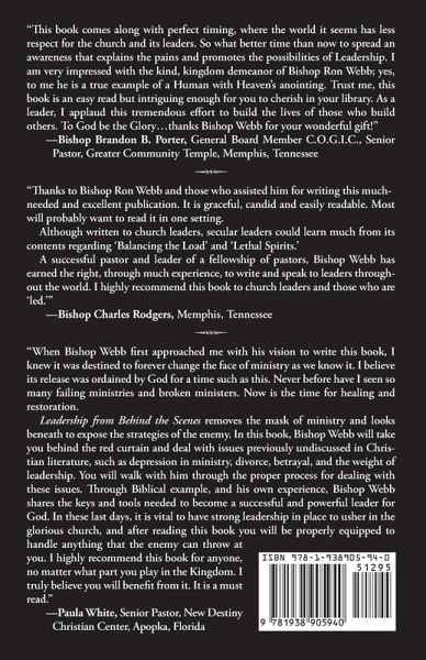 Leadership from Behind the Scenes removes the mask of ministry and looks beneath to expose the strategies of the enemy. In this book, Bishop Webb will take you behind the red curtain and deal with issues previously undiscussed in Christian literature, such as depression in ministry, divorce, betrayal, and the weight of leadership. You will walk with him through the proper process for dealing with these issues. Through Biblical example, and his own experience, Bishop Webb shares the keys and tools needed to become a successful and powerful leader for God. In these last days, it is vital to have strong leadership in place to usher in the glorious church, and after reading this book you will be properly equipped to handle anything that the enemy can throw at you. I highly recommend this book for anyone, no matter what part you play in the Kingdom. I truly believe you will benefit from it. It is a must read.