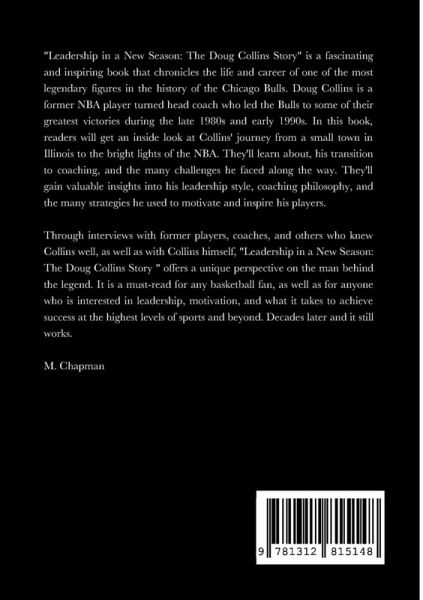 The secret of effective leadership still works for any leader. "Leadership in a New Season: The Doug Collins Story" is a fascinating and inspiring book that chronicles the life and career of one of the most legendary figures in the history of the Chicago Bulls. Doug Collins is a former NBA player turned head coach who led the Bulls to some of their greatest victories during the late 1980s and early 1990s. In this book, readers will get an inside look at Collins' journey from a small town in Illinois to the bright lights of the NBA. They'll learn about, his transition to coaching, and the many challenges he faced along the way. They'll gain valuable insights into his leadership style, coaching philosophy, and the many strategies he used to motivate and inspire his players. Through interviews with former players, coaches, and others who knew Collins well, as well as with Collins himself, "Leadership in a New Season: The Doug Collins Story " offers a unique perspective on the man behind the legend. It is a must-read for any basketball fan, as well as for anyone who is interested in leadership, motivation, and what it takes to achieve success at the highest levels of sports and beyond. Decades later and it still works.