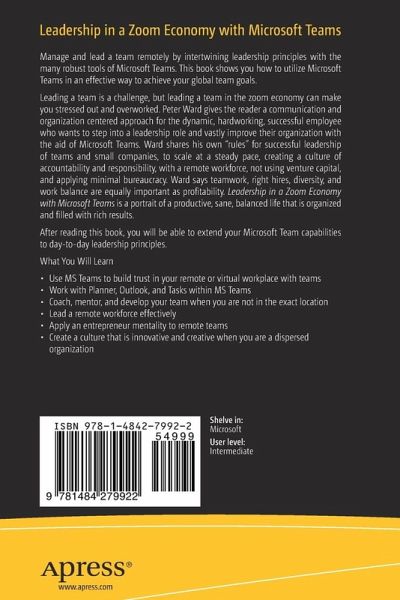 Leading a team is a challenge, but leading a team in the zoom economy can make you stressed out and overworked. Peter Ward gives the reader a communication and organization centered approach for the dynamic, hardworking, successful employee who wants to step into a leadership role and vastly improve their organization with the aid of Microsoft Teams. Ward shares his own "rules" for successful leadership of teams and small companies, to scale at a steady pace, creating a culture of accountability and responsibility, with a remote workforce, not using venture capital, and applying minimal bureaucracy. Ward says teamwork, right hires, diversity, and work balance are equally important as profitability. Leadership in a Zoom Economy with Microsoft Teams is a portrait of a productive, sane, balanced life that is organized and filled with rich results.