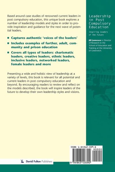 Leadership of different kinds exists at many levels in the post-compulsory sector-from principles to programme leaders, administrative staff and even caretakers. Based around case studies of current leaders in post-compulsory education, this unique book explores a number of leadership models and styles in order to provide inspiration and guidance for the next wave of potential leaders. * Captures authentic "voices of the leaders" * Includes examples of further, adult, community and prison education * Covers all type of leadership: charismatic leaders, academic leaders, spiritual leaders, women leaders, ethnic leaders, ethnic leaders, business leaders Presenting a wide and holistic view of leadership at different levels, this book is relevant for all potential and current leaders in post-compulsory education. By encouraging readers to review and reflect on the models described, the book will inspire leaders of the future to develop their own leadership styles and visions.