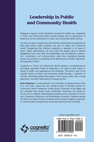 Designed to support current standards and goals for health care, Leadership in Public and Community Health provides readers with an examination of leadership and its implications for public and community health services. The book focuses on leaders who demonstrate transformational leadership as they guide public health initiatives and plan for public and community health. Recognizing that effective leadership is essential in all types of public health organizations, the text posits that leaders need to support engagement from many staff and stakeholders and use effective collaboration, coordination, and communication, while also considering diversity, equity, and inclusion, accessibility, social determinants of health, disparities, and population health. Leadership in Public and Community Health presents a multidimensional and highly applicable model of leadership at all levels to well support a variety of health care organizations and initiatives. This book is part of the Cognella Series on Public and Community Health Nursing, a collection of concise, informative guides that explore critical topical areas, their nursing application, and their relationship to nursing practice.