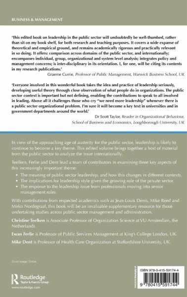 In view of the approaching age of austerity for the public sector, leadership is likely to continue to become a key theme. This edited volume brings together a host of material from the public sector to analyze the issue internationally. Teelken, Dent & Ferlie lead a team of contributors in examining three key aspects of this increasingly important theme: the meaning of public sector leadership, and how this changes in different contexts the implications for leadership style given the growing role of the private sector the response to the leadership issue from professionals moving into senior management roles. With contributions from respected academics such as Jean-Louis Denis, Mike Reed and Mirko Nordegraaf, this book will be an invaluable supplementary resource for those undertaking studies across public sector management and administration.
