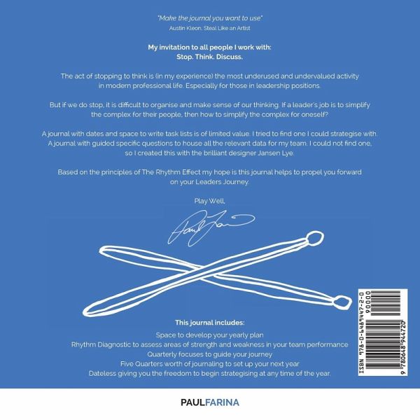 My invitation to all people I work with is to... Stop. Think. Reflect. Discuss. The act of stopping to think is (in my experience) the most underused and undervalued activity in modern professional life. Especially for those in leadership positions. But if we do get the chance to stop, it can be difficult to organise and make sense of our thinking. If a leader's job is to simplify the complex for their people, then how to simplify the complex for oneself? A calendarized journal with dates and space to write task lists is useful but limited. I tried to find one I could strategise with. A journal with specific guided questions to house all the relevant data for my team. I could not find one, so I created this journal with the brilliant designer Jansen Lye. Based on the principles of The Rhythm Effect my hope is this journal helps to propel you forward with clarity and power on your Leaders Journey.