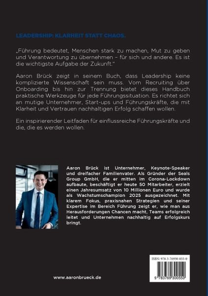 Führung bedeutet, Menschen stark zu machen, Mut zu geben und Verantwortung zu übernehmen - für sich und für andere. Es ist die wichtigste Aufgabe der Zukunft. Aaron Brück zeigt in seinem Buch, dass Leadership keine komplizierte Wissenschaft sein muss. Vom Recruiting über Onboarding bis hin zur Trennung bietet dieses Handbuch praktische Werkzeuge für jede Führungssituation. Es richtet sich an Unternehmer, Start Ups und Führungskräfte, die mit Klarheit und Vertrauen nachhaltigen Erfolg schaffen wollen. Ein inspirierender Leitfaden für einflussreiche Führungskräfte und die, die es werden wollen. - Mitarbeiter finden: Matchmaker - Dein Leitfaden für die erfolgreiche Personalssuche - Mitarbeiter auswählen: Bullseye. So triffst Du die beste Wahl. - Mitarbeiter onboarden: Ready for Take-Off. So bringst Du Deine Mitarbeiter auf Flugghöhe. - Mitarbeiter erfolgreich machen: Höchstleistung durch Führung. So setzt Dein Team Maßstäbe. - Mitarbeiter kündigen: Wenn¿s nicht mehr passt. Trennen mit Respekt und Weitsicht.