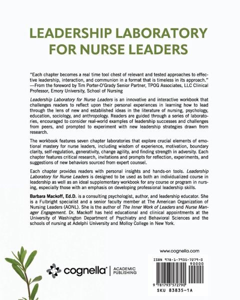 "Each chapter becomes a real time tool chest of relevant and tested approaches to effective leadership, interaction, and communion in a format that is timeless in its approach." -From the foreword by Tim Porter-O'Grady Senior Partner, TPOG Associates, LLC Clinical Professor, Emory University, School of Nursing Leadership Laboratory for Nurse Leaders is an innovative and interactive workbook that challenges readers to reflect upon their personal experiences in learning how to lead through the lens of new and established ideas in the literature of nursing, psychology, education, sociology, and anthropology. Readers are guided through a series of laboratories, encouraged to consider real-world examples of leadership successes and challenges from peers, and prompted to experiment with new leadership strategies drawn from research. The workbook features seven chapter laboratories that explore crucial elements of emotional mastery for nurse leaders, including wisdom of experience, motivation, boundary clarity, self-regulation, generativity, change agility, and finding strength in adversity. Each chapter features critical research, invitations and prompts for reflection, experiments, and suggestions of new behaviors sourced from expert counsel. Each chapter provides readers with personal insights and hands-on tools. Leadership Laboratory for Nurse Leaders is designed to be used as both an individualized course in leadership as well as an ideal supplementary workbook for any course or program in nursing, especially those with an emphasis on developing professional leadership skills.
