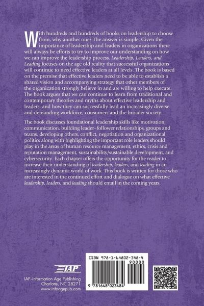 Why with hundreds and hundreds of books on leadership to choose from, why another one?" The answer is simple. Given the importance of leadership and leaders in organizations there will always be efforts to try to improve our understanding on how we can improve the leadership process. Leadership, Leaders and Leading focuses on the age old reality that successful organizations will continue to need effective leaders at all levels. The book is based on the premise that effective leaders need to be able to establish a shared vision and accompanying strategy that other members of the organization strongly believe in and are willing to help execute. The book argues that we can continue to learn from traditional and contemporary theories and myths about effective leadership & leaders and how they can successfully lead an increasingly diverse and demanding workforce, consumers and the broader society. The book discusses foundational leadership skills like motivation, communication, building leader-follower relationships, groups and teams, developing others, conflict, negotiation and organizational politics along with highlighting the important role leaders should play in the areas of human resource management, ethics, crisis and reputation management, sustainability/sustainable development, and cybersecurity. Each chapter offers the opportunity for the reader to increase their understanding of leadership, leaders and leading in an increasingly dynamic world of work. This book is written for those who are interested in the continued effort and dialogue on what effective leadership, leaders and leading should entail in the coming years.