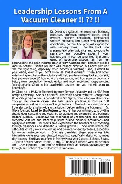 Dr. Olexa presents everyday guidance and solutions to seemingly insurmountable issues in your business and personal life. She offers gems of leadership wisdon, all from her observations and keen insights gleaned from watching her robotic vacuum cleaner. "When you hit a wall, change direction, but never give up." "Commit to your vision, even if you don't know all that it entails." "Success is not a straight line." "Be ready to take on a new opportunity." and "Recharge your batteries before you can't make it back to the docking station."