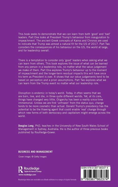 This book seeks to demonstrate that we can learn from both 'good' and 'bad' leaders. Part One looks at President Trump's behaviour from inauguration to impeachment. The ancient Greek concepts of Kairos and Chronos are used to indicate that Trump was almost a natural fit for the US of 2017. Part Two considers the consequences of his behaviour on the US, the world at large, and for leadership overall. There is a temptation to consider only 'good' leaders when asking what we can learn from others. This book explores the issue of what can be learned from any person in a leadership role, no matter what the value judgement we make of them. Part One explores Trump's behaviour up to the moment of impeachment and the longer-term residual impacts this will have once his term as President is over. It shows that our value judgements tend to be based on perception and a priori assumptions. Part Two explores what we can learn from the Trump event no matter what our leadership role. Disruption is endemic in today's world. Today, it often seems that we are born, live, and die, in three quite different worlds. Yet, at its core, things have changed very little. Oligarchy has been a reality since time immemorial. Unless we are first 'unfrozen' from the status quo, change tends to be more cosmetic than actual. Donald Trump's presidency has the potential to be the thawing agent that could enable 'real' change through which new forms of both democracy and capitalism might emerge across the world.