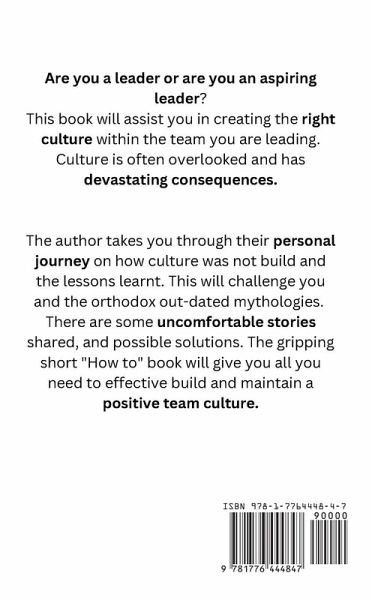 Are you a leader or are you an aspiring leader? This book will assist you in creating the right culture within the team you are leading. Culture is often overlooked and has devastating consequences. The author takes you through their personal journey on how culture was not build and the lessons learnt. This will challenge you and the orthodox out-dated mythologies. There are some uncomfortable stories shared, and possible solutions. The gripping short "How to" book will give you all you need to effective build and maintain a positive team culture. The book supplies a interactive workbook to help you through your journey in building a team culture. Don't miss your opportunity to dive into the mind of an experienced leader with over 18 years experience in successfully leading teams.