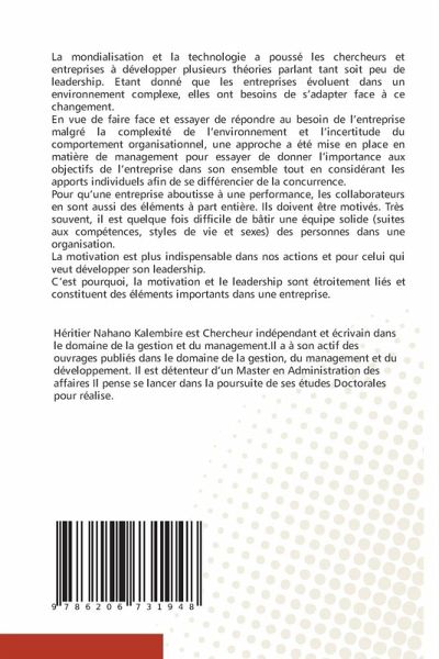 La mondialisation et la technologie a poussé les chercheurs et entreprises à développer plusieurs théories parlant tant soit peu de leadership. Etant donné que les entreprises évoluent dans un environnement complexe, elles ont besoins de s'adapter face à ce changement.En vue de faire face et essayer de répondre au besoin de l'entreprise malgré la complexité de l'environnement et l'incertitude du comportement organisationnel, une approche a été mise en place en matière de management pour essayer de donner l'importance aux objectifs de l'entreprise dans son ensemble tout en considérant les apports individuels afin de se différencier de la concurrence.Pour qu'une entreprise aboutisse à une performance, les collaborateurs en sont aussi des éléments à part entière. Ils doivent être motivés. Très souvent, il est quelque fois difficile de bâtir une équipe solide (suites aux compétences, styles de vie et sexes) des personnes dans une organisation.La motivation est plus indispensable dans nos actions et pour celui qui veut développer son leadership.C'est pourquoi, la motivation et le leadership sont étroitement liés et constituent des éléments importants dans une entreprise.
