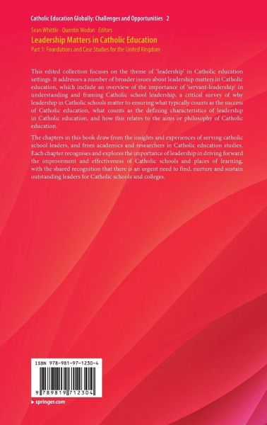 This edited collection is the first part of a two-volume set., which focuses on leadership in Catholic education settings in the United Kingdom. It includes an overview of the importance of different types of leadership, including 'servant-leadership', in understanding and framing Catholic school practice, a critical survey of why leadership matters to ensuring the success of Catholic education, and a discussion of what counts as the defining characteristics of leadership in Catholic education and how this relates to the aims or philosophy of Catholic education. The chapters in this book draw from the insights and experiences of serving Catholic school leaders as well as from academics and researchers in Catholic education studies. The final two chapters provide a comparative analysis for the United Kingdom in a global perspective using data from the Organisation for Economic Co-operation and Development (OECD) . Together, the chapters argue that there is an urgent need to find, nurture, and sustain outstanding leaders for Catholic schools and colleges.