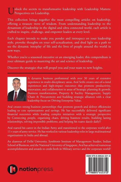 Unlock the secrets to transformative leadership with Leadership Matters: Perspectives on Leadership. This collection brings together the most compelling articles on leadership, offering a treasure trove of wisdom. From understanding leadership to the dynamism of leadership in the digital and ultra connected world, each article is crafted to inspire, challenge, and empower leaders at every level. Each chapter intends to make you ponder and introspect on your leadership style, provoke thoughts on your self-actualization, and shed light on a path to see the dynamic interplay of life and the lives of people around the world in new ways. Whether you're a seasoned executive or an emerging leader, this compendium is your ultimate guide to mastering the art and science of leadership. Discover the strategies that will propel you and your team to new heights.