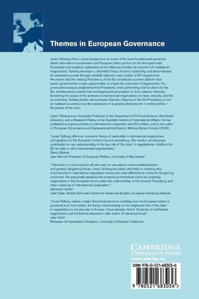In this 2006 book, Jonas Tallberg offers a novel perspective on some of the most fundamental questions about international cooperation and European Union politics. Offering the first systematic theoretical and empirical exploration of the influence wielded by chairmen of multilateral negotiations, Tallberg develops a rationalist theory of formal leadership and demonstrates its explanatory power through carefully selected case studies of EU negotiations. He shows that the rotating Presidency of the EU constitutes a power platform that grants governments unique opportunities to shape the outcomes of negotiations. His provocative analysis establishes that Presidencies, while performing vital functions for the EU, simultaneously exploit their privileged political position to favour national interests. Extending the scope of the analysis to international negotiations on trade, security and the environment, Tallberg further demonstrates that the influence of the EU Presidency is not an isolated occurrence but the expression of a general phenomenon in world politics - the power of the chair.