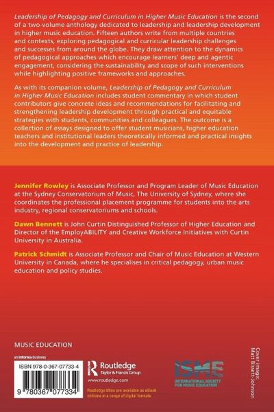 Foreword Pathways to leadership in higher music education (Don Lebler) / Chapter I How is leadership practised in higher music education? (Jennifer Rowley and Dawn Bennett) / Chapter II Leadership in the transition from music student to professional musician: The Civic Orchestra of Chicago Fellowship (Sara Ascenso, Jonathan McCormick and Rosie Perkins) / Chapter III Developing leadership skills in performing arts graduates: A case study of an extracurricular community project (Judith Brown) / Chapter IV Preparing the twenty-first century professional musician: Leading curricular changes to keyboard musicianship classes (Margaret Young, Cynthia Stephens-Himonides and Martha Hilley) / Chapter V Leadership in the ensemble setting: Lessons from the engine room (Annie Mitchell) / Chapter VI Creative leadership in action through a conservatoire-based MSc in Performance Science (Rosie Perkins and Aaron Williamon) / Chapter VII Identifying skills for successful classical music careers: Implications for higher education studio teaching leadership (Katie Zhukov) / Chapter VIII Leading changes through a study on memorisation: Professional musicians as researchers (Pétur Jónasson and Tânia Lisboa) / Chapter IX The musician as teacher: Navigating future self for career development (Jennifer Rowley) / Chapter X Student commentary: Balancing higher education; Not just employability (Remington C. H. Owen) / Chapter XI Leading change in higher music education pedagogy and curriculum (Dawn Bennett and Jennifer Rowley) The International Society for Music Education / The ISME Commission on the Education of the Professional Musician / Index