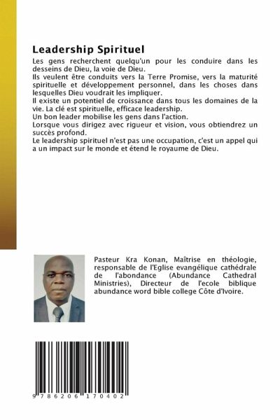 Les gens recherchent quelqu'un pour les conduire dans les desseins de Dieu, la voie de Dieu.Ils veulent être conduits vers la Terre Promise, vers la maturité spirituelle et développement personnel, dans les choses dans lesquelles Dieu voudrait les impliquer.Il existe un potentiel de croissance dans tous les domaines de la vie. La clé est spirituelle, efficace leadership.Un bon leader mobilise les gens dans l'action.Lorsque vous dirigez avec rigueur et vision, vous obtiendrez un succès profond.Le leadership spirituel n'est pas une occupation, c'est un appel qui a un impact sur le monde et étend le royaume de Dieu.