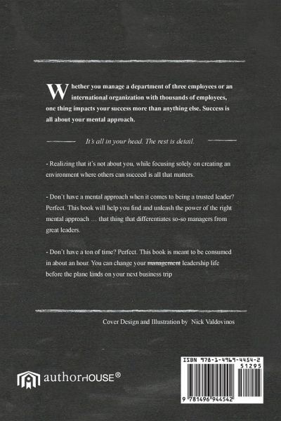 Whether you manage a department of three employees or an international organization with thousands of employees, one thing impacts your success more than anything else. Success is all about your mental approach. It's all in your head. The rest is detail. - Realizing that it's not about you, while focusing solely on creating an environment where others can succeed is all that matters. - Don't have a mental approach when it comes to being a trusted leader? Perfect. This book will help you find and unleash the power of the right mental approach ... that thing that differentiates so-so managers from great leaders. - Don't have a ton of time? Perfect. This book is meant to be consumed in about an hour. You can change your management leadership life before the plane lands on your next business trip