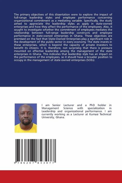The primary objectives of this dissertation were to explore the impact of full-range leadership styles and employee performance concerning organizational commitment as a mediating variable. Specifically, the study aimed to appreciate the leadership styles as apply in state-owned enterprises and how they affect the performance of the employees. Also, it sought to investigate whether the commitment of employees mediates the relationship between full-range leadership constructs and employee performance in state-owned enterprises in Ghana. These objectives are premised on the fact that State-Owned Enterprises play a significant role in the development of the public sector in every economy. The state invests in these enterprises, which is beyond the capacity of private investors to benefit its citizens. It is, therefore, not surprising that there is pressure mounted on effective leadership among the management of the state enterprises in Ghana. This indicates that leadership style hasan impact on the performance of the employees, so it should have a broader position to occupy in the management of state-owned enterprises (SOEs).