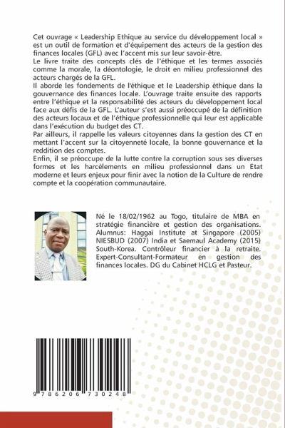 Cet ouvrage « Leadership Ethique au service du développement local » est un outil de formation et d'équipement des acteurs de la gestion des finances locales (GFL) avec l'accent mis sur leur savoir-être. Le livre traite des concepts clés de l'éthique et les termes associés comme la morale, la déontologie, le droit en milieu professionnel des acteurs chargés de la GFL.Il aborde les fondements de l'éthique et le Leadership éthique dans la gouvernance des finances locale. L'ouvrage traite ensuite des rapports entre l'éthique et la responsabilité des acteurs du développement local face aux défis de la GFL. L'auteur s'est aussi préoccupé de la définition des acteurs locaux et de l'éthique professionnelle qui leur est applicable dans l'exécution du budget des CT.Par ailleurs, il rappelle les valeurs citoyennes dans la gestion des CT en mettant l'accent sur la citoyenneté locale, la bonne gouvernance et la reddition des comptes. Enfin, il se préoccupe de la lutte contre la corruption sous ses diverses formes et les harcèlements en milieu professionnel dans un Etat moderne et leurs enjeux pour finir avec la notion de la Culture de rendre compte et la coopération communautaire.