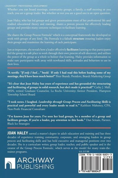 Whether you run board meetings, community groups, a family, a staff meeting or you teach, you are a group leader. But whether or not you are a good one is an open question. Joan Haley, who has led groups and given presentations most of her professional life and studied educational theory and training, shares a proven process for effectively leading groups and provides many concrete techniques to facilitate learning. She shares the Group Process Formula® which is a conceptual framework she developed to work with groups of any kind. The Formula is a failsafe structure ensuring leaders enjoy their groups and maximizes the learning of each participant. Just as important, she reveals how a leader effectively facilitates learning so that participants feel the group is a safe place to work through their own process of self-discovery, and utilizes the power of the group as a whole to bolster that learning. Haley provides information to make sure participants walk away with newfound skills, attitudes and behaviors to use in their lives.
