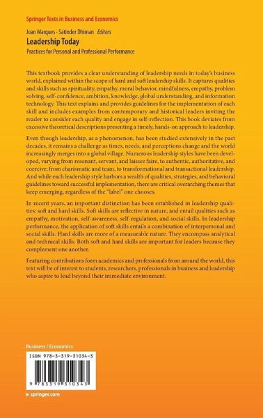 Part I Soft Skills.- Ch 1 Leadership and Purpose.- Ch 2 Leadership and Trust.- Ch 3 Leadership and Moral Behavior.- Ch 4 Leadership and Values.- Ch 5 Leadership and Vision.- Ch 6 Leadership and Authenticity.- Ch 7 Leadership and Emotional Intelligence.- Ch 8 Leadership and Spirituality.- Ch 9 Leadership and Sustainability.- Ch 10 Leadership and Mindfulness.- Ch 11 Leadership and Empathy.- Ch 12 Leadership and Motivation.- Ch 13 Leadership and Communication.- Ch 14 Leadership and Dependability.- Ch 15 Leadership and Creativity.- Ch 16 Leadership and Initiative.- Ch 17 Leadership and Self-Confidence.- Ch 18 Leadership and Resilience.- Ch 19 Leadership and Perseverance.- Part II Hard Skills.- Ch 20 Leadership and Ambition.- Ch 21 Leadership and Global Understanding.- Ch 22 Leadership and Information Technology.- Ch 23 Leadership and Planning.