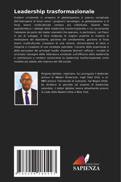 Guidare un'azienda in un'epoca di globalizzazione è spesso complicato dall'interazione di forze come i progressi tecnologici, la globalizzazione e la forza lavoro multiculturale sempre più sofisticata. Questo libro approfondisce i dettagli della leadership trasformazionale e ne raccomanda l'adozione da parte dei leader aziendali che operano, in particolare, nei Paesi in via di sviluppo. Il libro evidenzia le migliori pratiche in materia di motivazione dei dipendenti, gestione del cambiamento, gestione di forza lavoro multiculturale, creazione di una visione, dimostrazione di etica e integrità e creazione di una strategia aziendale. L'esame delle esperienze e delle percezioni dei principali leader d'azienda liberiani rafforza i risultati di un'ampia rassegna della letteratura esistente sull'efficacia della leadership e contribuisce a rendere convincente la leadership trasformazionale come modello più adatto alle imprese del XXI secolo.