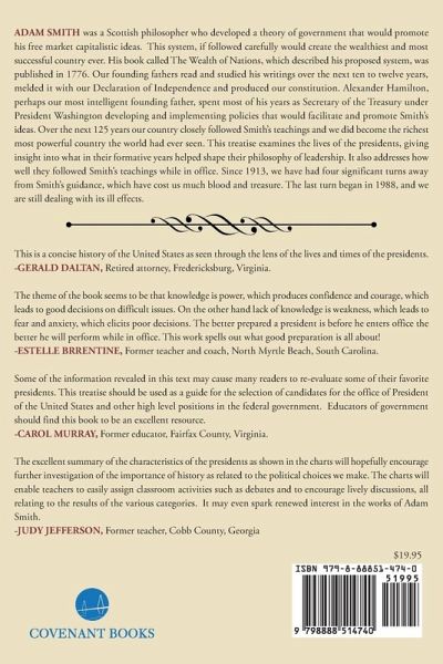 ADAM SMITH was a Scottish philosopher who developed a theory of government that would promote his free market capitalistic ideas. This system, if followed carefully would create the wealthiest and most successful country ever. His book called The Wealth of Nations, which described his proposed system, was published in 1776. Our founding fathers read and studied his writings over the next ten to twelve years, melded it with our Declaration of Independence and produced our constitution. Alexander Hamilton, perhaps our most intelligent founding father, spent most of his years as Secretary of the Treasury under President Washington developing and implementing policies that would facilitate and promote Smith's ideas. Over the next 125 years our country closely followed Smith's teachings and we did become the richest most powerful country the world had ever seen. This treatise examines the lives of the presidents, giving insight into what in their formative years helped shape their philosophy of leadership. It also addresses how well they followed Smith's teachings while in office. Since 1913, we have had four significant turns away from Smith's guidance, which have cost us much blood and treasure. The last turn began in 1988, and we are still dealing with its ill effects.