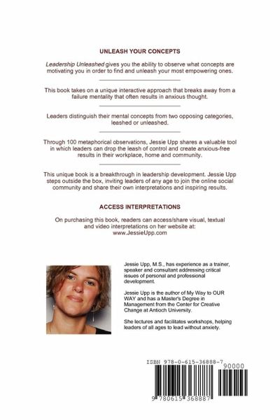 Jessie Upp, M.S., believes that a whole new range of possibilities and actions become available when people create new ways of relating to ideas, people, actions and the Self. This is accomplished by playing with one's attention. Ms. Upp created Leadership Unleashed as a thought-provoking workbook that sets the stage for playing with the imagination so that it is possible to become uninhibited, unlimited and unleashed in any moment. Designed to be opened at any page, this book includes 100 short observations that challenges one's state of mind such as "The only sources of an anxious mind come from a projected loss in the past or future." Readers are invited to consider the observation's validity, journal their interpretations and complete epigrams with illustrations. This book is meant to decrease unnecessary anxiety so leaders can effectively unleash potential in their workplace, home and community. On purchasing the book, readers are invited to share/access interpretations on www.JessieUpp.com.