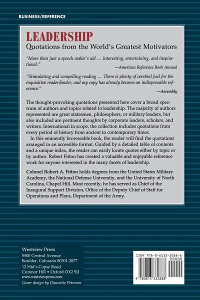 The thought-provoking quotations presented here cover a broad spectrum of topics related to leadership. The majority of authors represented are great statesmen, philosophers, or military leaders, but also included are pertinent thoughts by corporate leaders, scholars, and writers. International in scope, the collection includes quotations from every period of history from ancient to contemporary times.In this eminently browseable book, the reader will find the quotations arranged in an accessible format. Guided by a detailed table of contents and a unique index, the reader can easily locate quotes either by topic or by author. Robert Fitton has created a valuable and enjoyable reference work for anyone interested in the many facets of leadership.