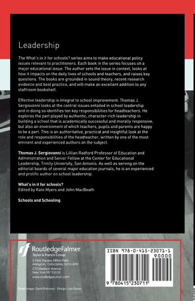 The What's in it for Schools series has been written by experts in the field for an audience of busy practitioners. The books present research and thinking about topical education issues and present it in an accessible and relevant way. What makes a good leader? Does good leadership matter in helping schools be more successful? This concise and accessible book examines leadership in a practical way by helping principals, heads, teachers and parents establish their roles and responsibilities and get to grips with the unique leadership requirements of schools. The author explores issues such as leadership, what it is and how it works, character and culture as keys to improvement, how to build commitment, motivation and improved performance, and using local standards and assessments to improve schools and leadership as a form of social capital.