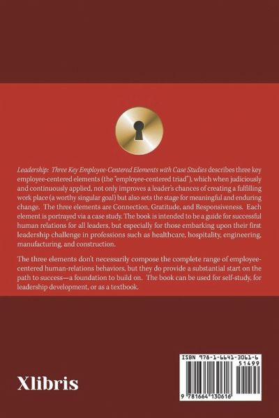 Leadership: Three Key Employee-Centered Elements with Case Studies describes three key employee-centered elements (the "employee-centered triad"), which when judiciously and continuously applied, not only improve a leader's chances of creating a fulfilling workplace (a worthy singular goal) but also set the stage for meaningful and enduring change. The three elements are Connection, Gratitude, and Responsiveness. Each element is portrayed via a case study. The book is intended to be a guide for successful human relations for all leaders, but especially for those embarking upon their first leadership challenge in professions such as healthcare, hospitality, engineering, manufacturing, and construction. The three elements don't necessarily compose the complete range of employee-centered human-relations behaviors, but they do provide a substantial start on the path to success-a foundation to build on. The book can be used for self-study, for leadership development, or as a textbook.