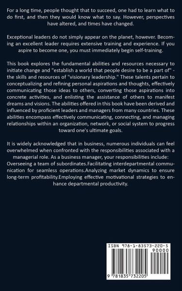 For a long time, people thought that to succeed, one had to learn what to do first, and then they would know what to say. However, perspectives have altered, and times have changed. Exceptional leaders do not simply appear on the planet, however. Becoming an excellent leader requires extensive training and experience. If you aspire to become one, you must immediately begin self-training. This book explores the fundamental abilities and resources necessary to initiate change and "establish a world that people desire to be a part of" - the skills and resources of "visionary leadership." These talents pertain to conceptualizing and refining personal aspirations and thoughts, effectively communicating those ideas to others, converting those aspirations into concrete activities, and enlisting the assistance of others to manifest dreams and visions. The abilities offered in this book have been derived and influenced by proficient leaders and managers from many countries. These abilities encompass effectively communicating, connecting, and managing relationships within an organization, network, or social system to progress toward one's ultimate goals. It is widely acknowledged that in business, numerous individuals can feel overwhelmed when confronted with the responsibilities associated with a managerial role. As a business manager, your responsibilities include: Overseeing a team of subordinates. Facilitating interdepartmental communication for seamless operations. Analyzing market dynamics to ensure long-term profitability. Employing effective motivational strategies to enhance departmental productivity.