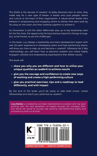 The 2020s is the decade of LeaderX. As Baby Boomers start to retire, they make way for a new type of leader. A leader who puts people, teams and culture at the heart of their organisation. A values-driven leader who believes in empowering and engaging others to deliver their best work by focusing on the vision and then working together to achieve it. As GenerationX and the older Millenials step up to key leadership roles for the first time, the opportunity for long-lasting impactful change is huge, but, to be honest, so are the challenges. In this book, Lucy Barkas, a leadership and team development expert with over 20 years’ experience in developing talent and high-performing teams, will show you how to step up and become a LeaderX. Following her 5 Mys methodology, you will learn how to become LeaderX and create highly engaged, cohesive and empowering organisations that deliver results. This book will: show you why you are different and how to utilise your unique qualities as LeaderX and achieve results give you the courage and confidence to create new ways of working and create a high performing culture give you practical exercises, tips and a roadmap to lead differently with impact By the end of the book, you’ll be ready to take bold action, create followership and reach your potential as LeaderX Lucy Barkas is a leadership and team development consultant who has been working with the next generation of leaders through her company 3WH. She found her secret to success was building high-performing teams and empowering others to achieve.